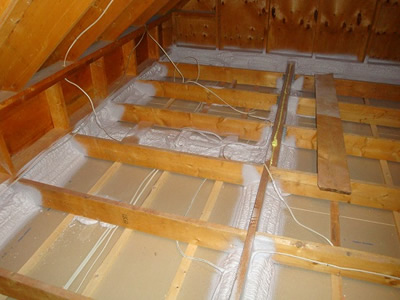 The wall in which the attic access door is in, was poorly insulated. The existing fiberglass insulation was removed. The wall was covered with 4” of spray foam insulation on the attic side.
